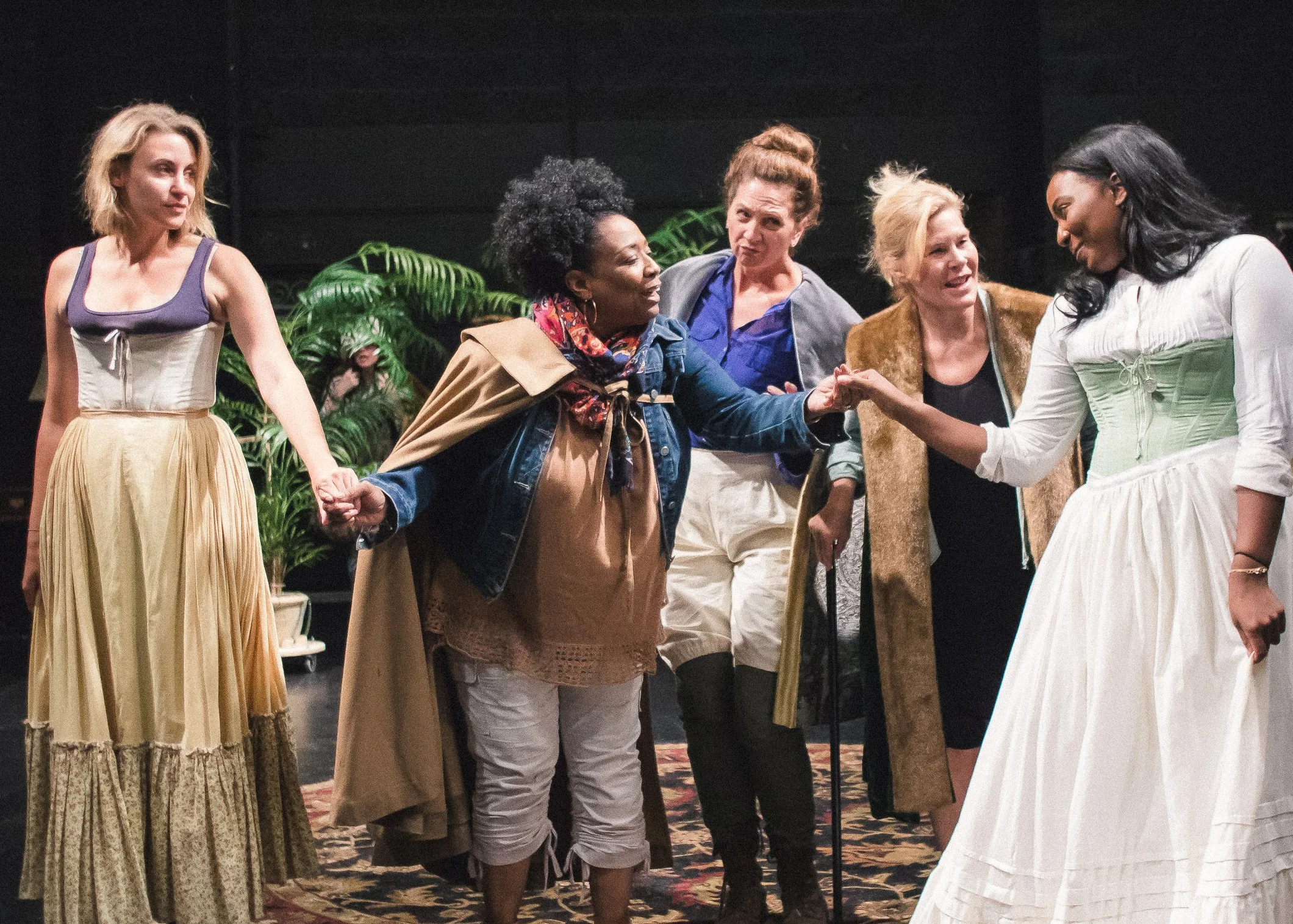 (l-r) Alexandra Henrikson as Katherine, E. Faye Butler as Baptista, Tina Gluschenko as Hortensio, Hollis Resnik as Gremio, and Olivia Washington as Bianca. Photo by joe mazza.