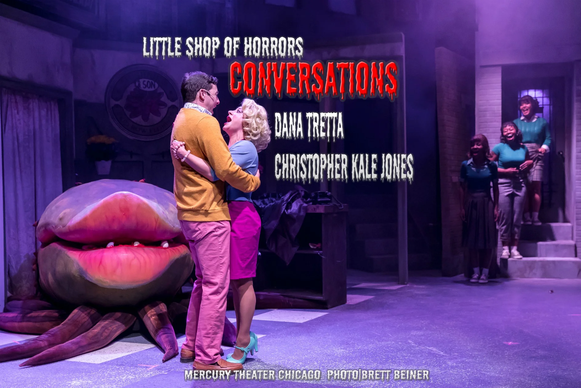 Early in the CONVERSATION with Dana Tretta and Christopher Kale Jones about their roles in the superb Mercury Theater Chicago production of “Little Shop of Horrors” directed by L Walter Stearns with musical director Eugene Dizon, we learn just how fiendishly desperate—and painfully real—things are for the star-crossed lovers. Jones plays Seymour Krelborn, the orphaned employee who lives at Mushnik’s Skid Row Floral Shop in the macabre 1982 hit with music by Alan Menken and book and lyrics by Howard Ashman. Seymour has dreams of capturing the affections of his sweet co-worker Audrey played by Tretta, who is mired in an abusive relationship with Dr. Orin, a dentist who lives his life gleefully inflicting pain on others. With Mushnik’s business withering on the vine, the two convince him to showcase an odd little plant, known as ‘Audrey II, that Seymour has been nursing back to life. The trouble is as Audrey II’s influence and appetite grows, everyone else starts looking like the next course on the menu.