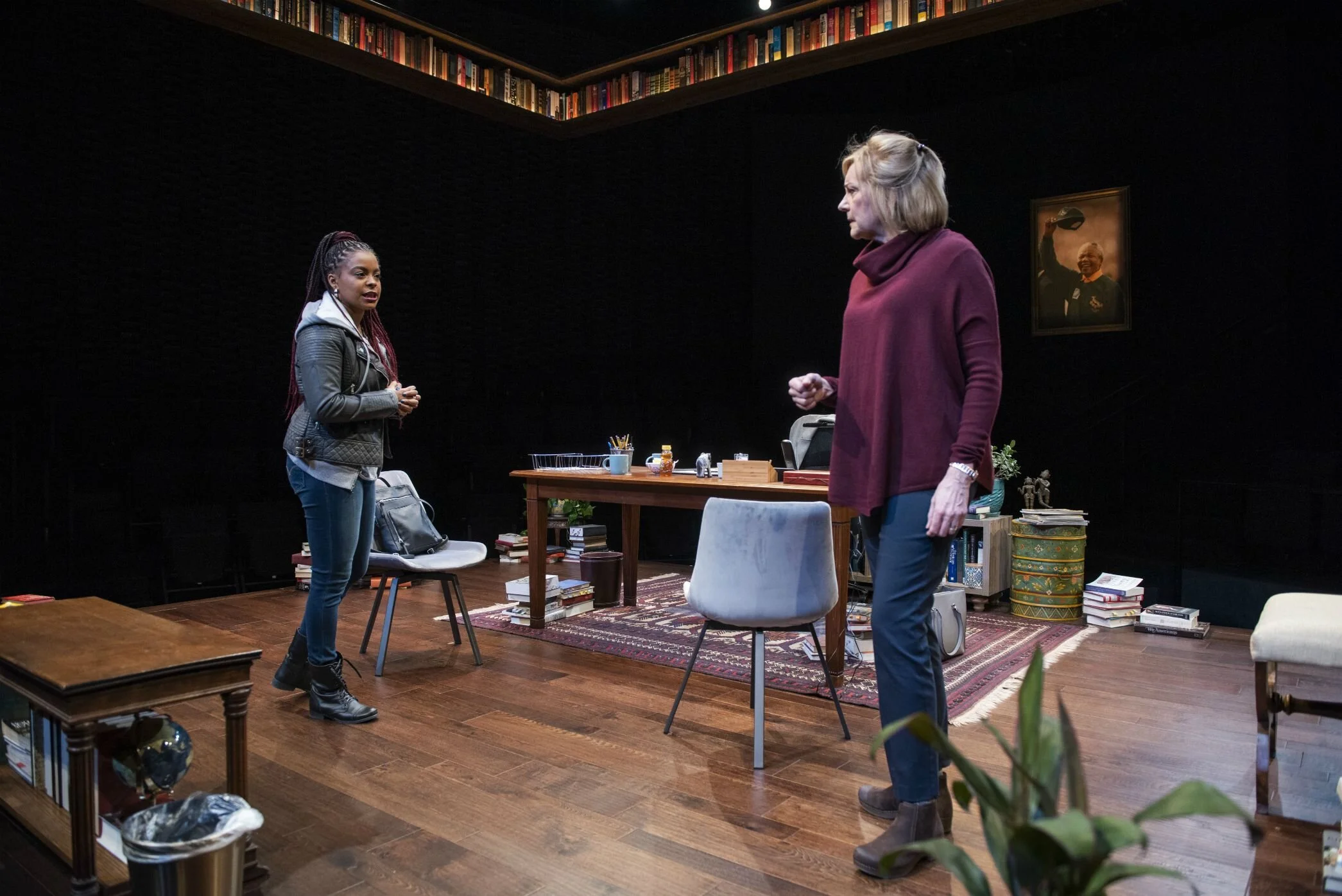 Washington’s portrait is no longer on the wall when the two women get together a second time at scenic designer Courtney O’Neill’s exquisite coffered academic office, set in the round replete with volumes of books, the summation of a career in the study of transformative and societal change. And while every book may hold the key to unlock an opinion of how we got to this point, one smartphone proves to be the most influential—and powerfully persuasive—object of all.