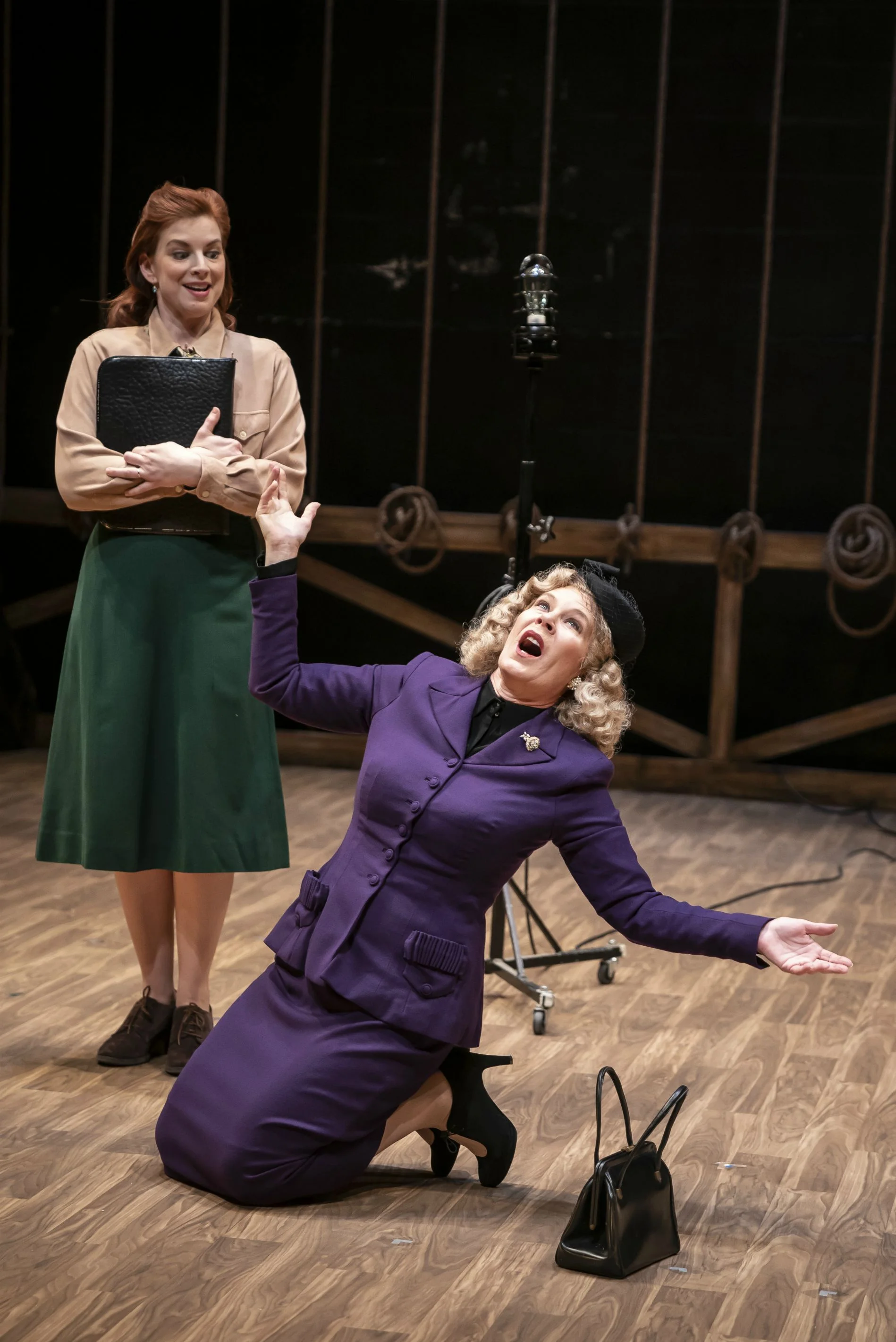 There is a certain amount of hand-holding for each of the other players, too. Grace Richards (Annie Munch), who has recently moved to town, struggles with her confidence, and June Bennett (Molly Hernandez) is wrapped up tightly in supporting the war effort. With few options after auditions, Maggie enlists Fred’s socialite spouse Winifred (Penny Slusher) to take a turn at Falstaff. All the while, the company’s creative team—stage manager Stuart Lasker (Mitchell J. Fain) and costumer Ida Green (Penelope Walker)—help keep Maggie and the cast on something akin to the accordion-like schedule that Maggie’s husband had originally proposed.