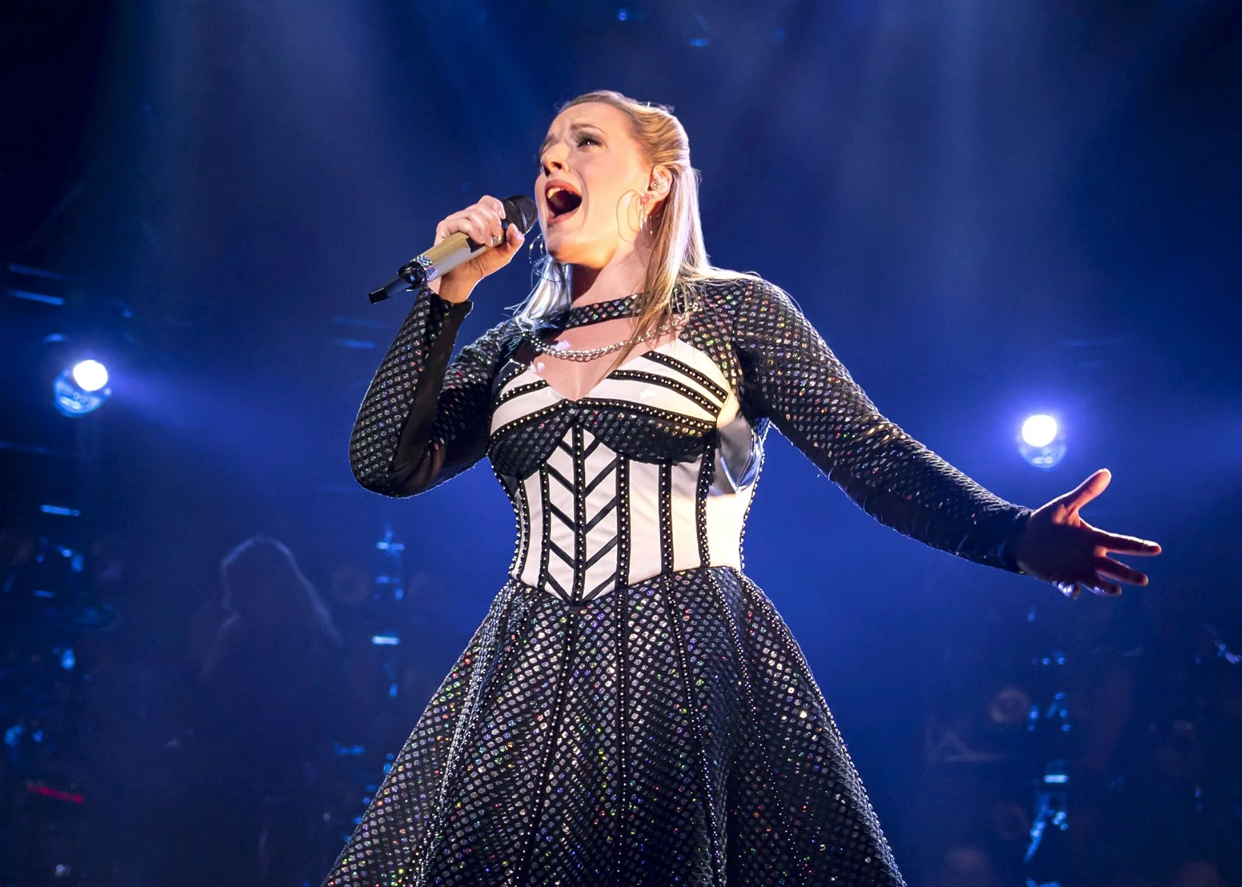 Set on an Emma Bailey step-tiered concert stage, decked out in radiant Gabriella Slade costumes, under the pulsating lighting of Tim Deiling and invigorated with the sonic sound display of Paul Gatehouse, the women of “SIX” upend the classic story of Henry’s conquests with their singular perspective: a view from the other side of history framed in the voice, rhythm, social substance and unity of our time.