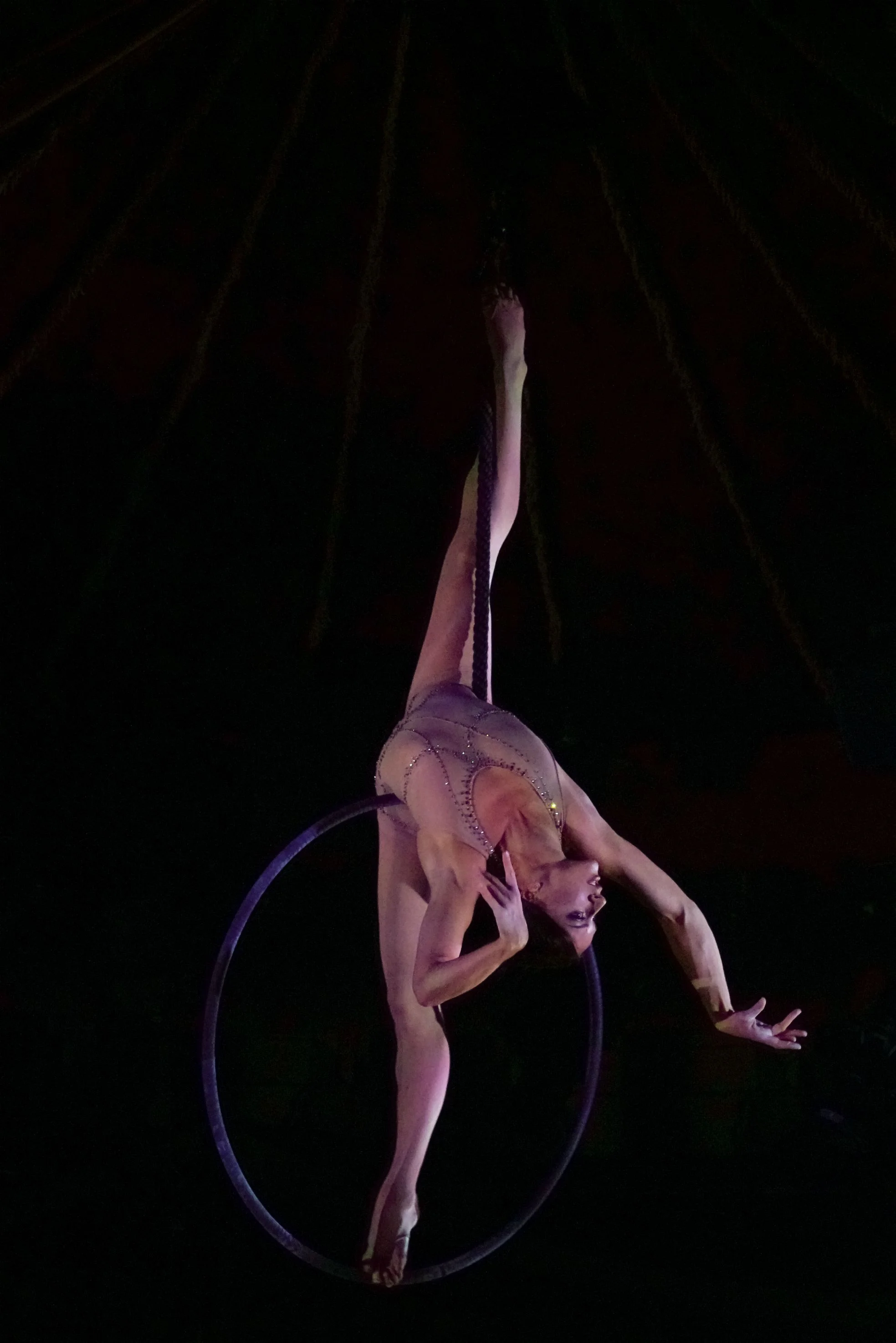 In the middle of the pre-opening activities, all under the ingenious direction of Norman Langill and co-director/choreographer Dreya Weber, a large group huddled at the opening of the glistening 100-year-old tent—surrounded by ornate stained-glass panels, enveloped in lush red velvet and rich wood craftsmanship—and struggled mightily as one to push and pull a thick rubber sleeve over a 30-foot pole. The person in charge, I would learn later, was a member of the performing troupe, French artist Domitil Aillot, whose work on the Chinese Pole is world-renowned.