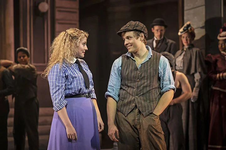 With music by Alan Menken and lyrics by Jack Feldman, the book by Harvey Fierstein centers on a class-conscious love story between union organizer/artist/westward dreamer Jack Kelly and critic/reporter Katherine Plumber–Alex Prakken and Justine Cameron in sparkling performances–and the challenge by publisher and robber-baron Joseph Pulitzer (a delightfully stern Bret Tuomi) to put the squeeze on the youth labor force of the day.