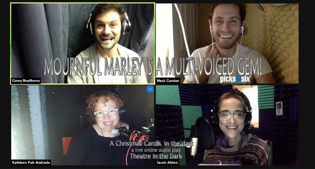 The true-to-original adaptation by Mack Gordon allows the superb cast, who are located in home studios of their own, to seamlessly weave together a production that feels as if together in a studio. The technical challenges involved behind this evolving technology, and the artful delivery of the ensemble in a live situation, puts Theatre in the Dark’s production of “A Christmas Carol” in a bright, shining class all by itself.