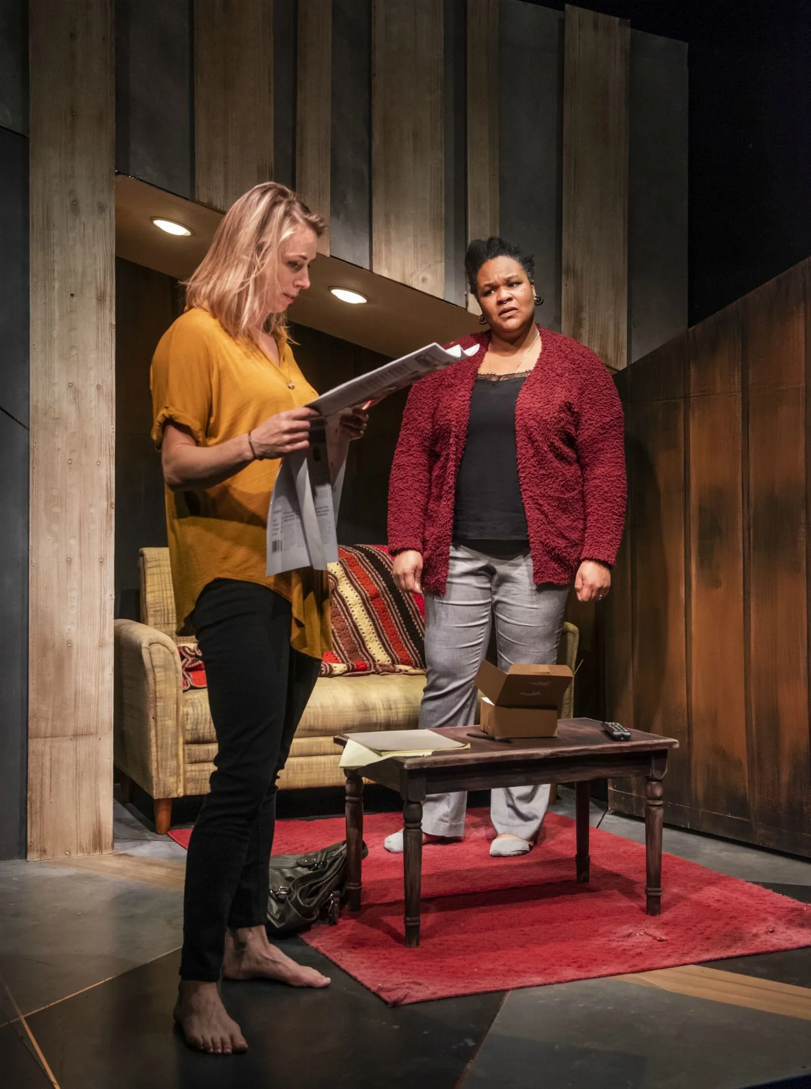 Answers to these questions can be found in American Blues Theater’s Chicago premiere production of Christina Telesca Gorman’s “ROAN @ the Gates,” a fascinating and absorbing two-hander—featuring superb performances by Brenda Barrie and Jasmine Bracey—about a couple wrestling over the fine line between whistleblower and traitor, and the enormous impact that exposing injustice in our society can have on personal relationships.