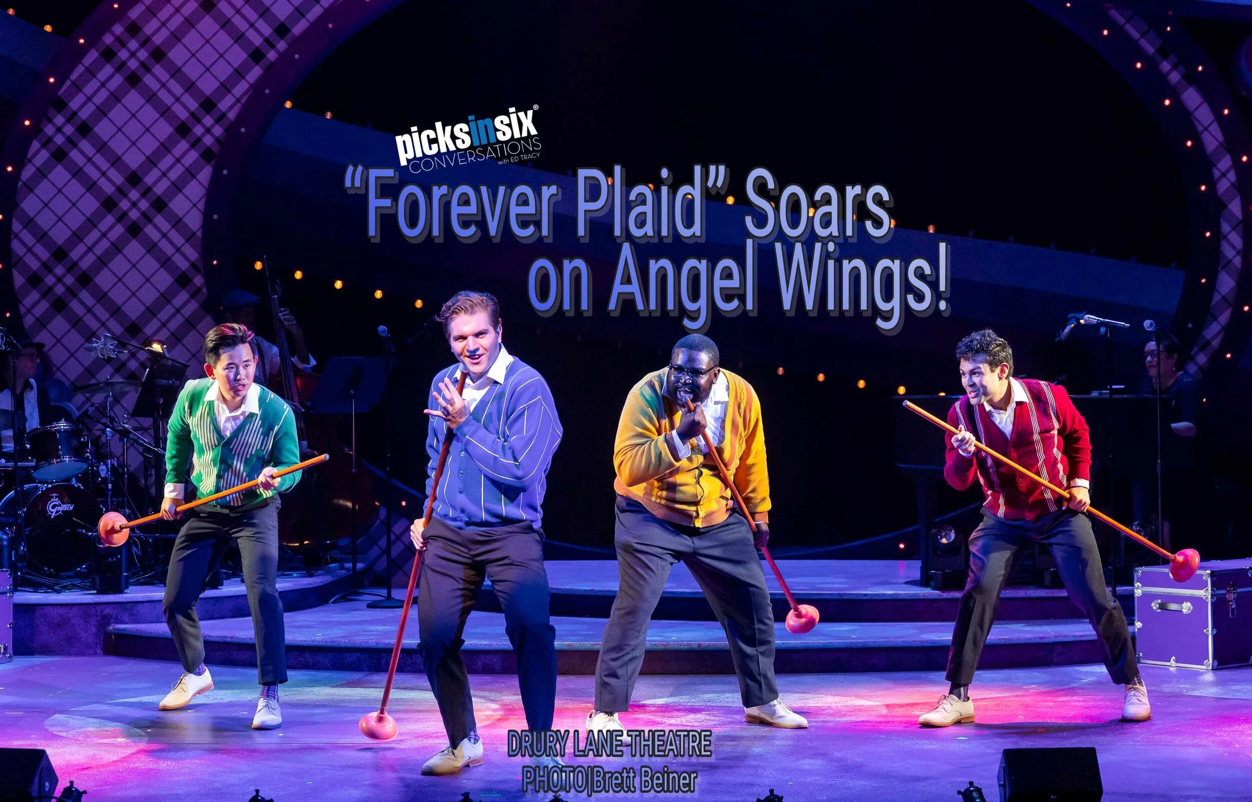 The lads in plaid descended from the afterlife to Drury Lane Theatre on Thursday night to complete their first professional gig, a 1964 journey to the airport Hilton cocktail bar, The Fusel-Lounge, cut short by a fatal collision with a school bus headed for the Beatles first appearance on The Ed Sullivan Show. The story might have ended there with the group harmonizing a favorite chord while on the way to pick up new plaid tuxes for the gig, except, of course, for divine intervention, the magic of live theatre and the fertile and creative mind of Stuart Ross.