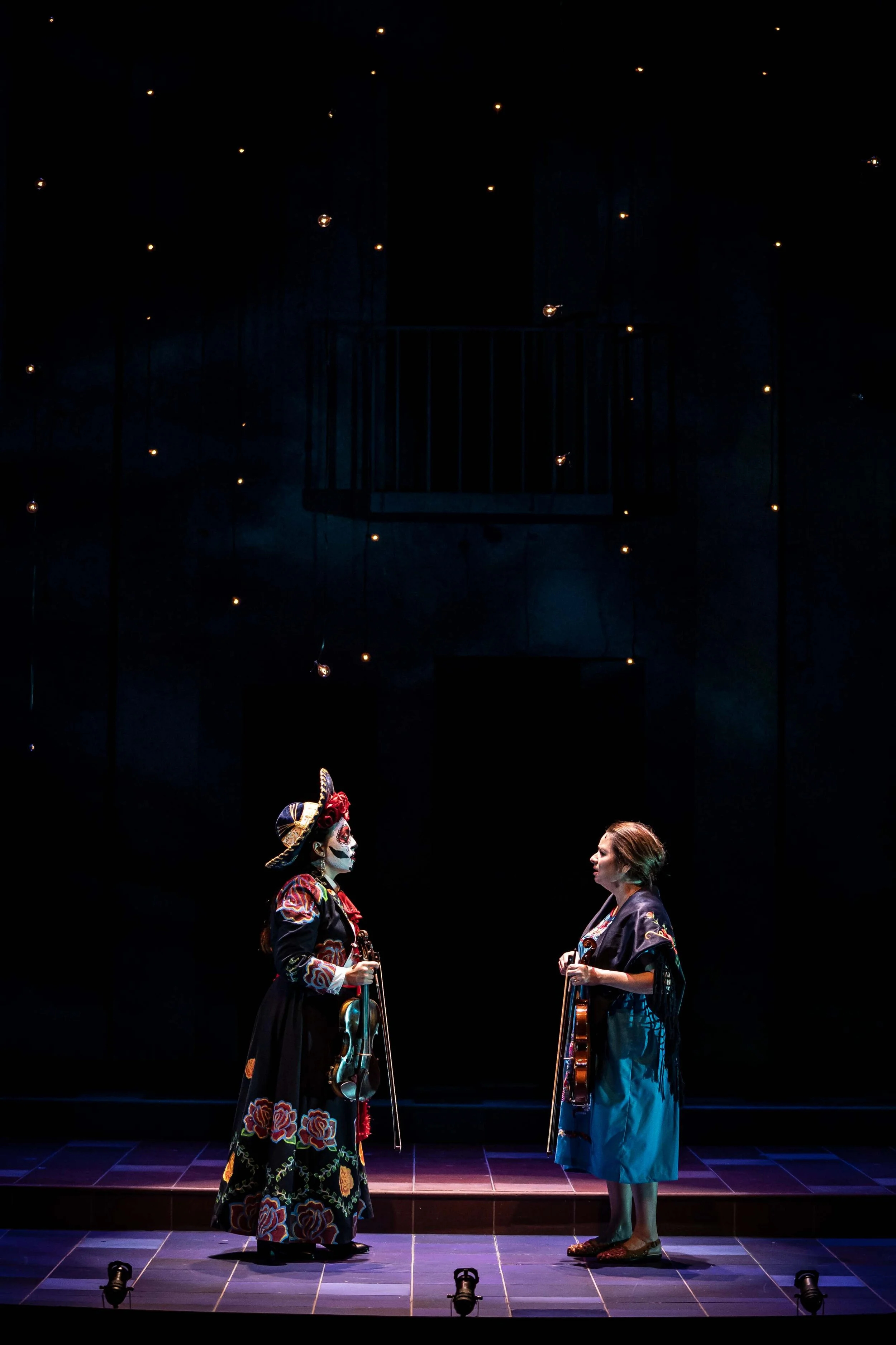 The fiesta of the “American Mariachi” audience experience began as we approached the Goodman Theatre. There, entertaining beneath the glowing-red marquee, was Chicago’s all-female mariachi band, Mariachi Sirenas! Once inside, as the lights dimmed, the members of Mariachi Sirenas took their seats in the masked, full house. The bilingual curtain speech, first in Spanish, then in English, set the tone for the night: a multicultural fusion of reality, memory, and music.