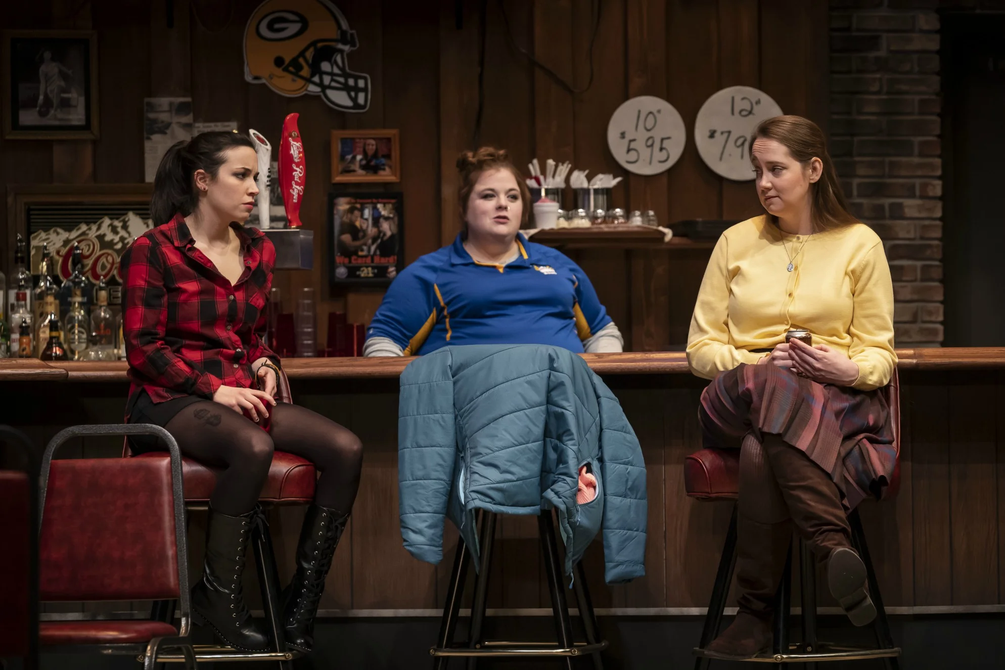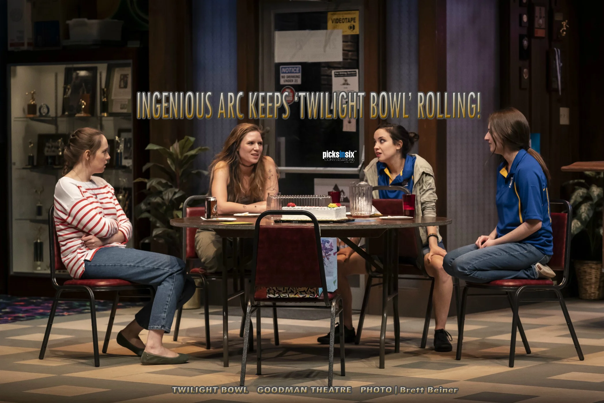 The absorbing backstories of the young women in “Twilight Bowl,” the world premiere of Rebecca Gilman’s delectable slice-of-rural-life directed by Erica Weiss that opened Tuesday at Goodman Theatre, flicker intensely in the neon glow of a Wisconsin bowling alley as Jaycee (Heather Chrisler), her best friend Clarice (Hayley Burgess), cousin Sam (Becca Savoy) and faith-based pal Sharlene (Anne E. Thompson) huddle around a table in the bar. Jaycee’s colorful past is sometimes shocking and there is cake, but we soon discover that she has made some bad choices recently and will be going away for a while. For the group’s members, who have spent their youth together and worked and grew up in and around the bowling alley, this is bittersweet farewell.