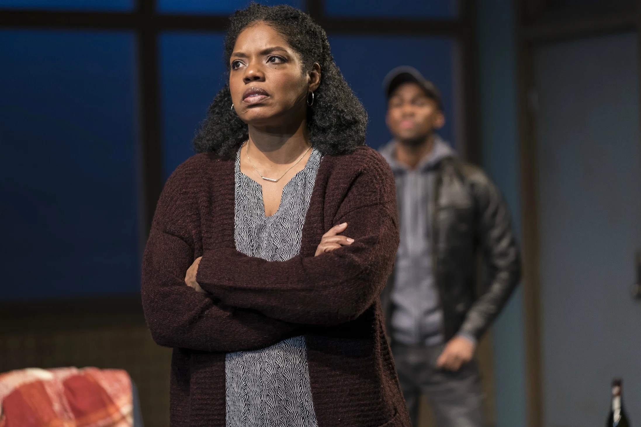 In and through Morisseau’s insightful story, deftly directed by Cheryl Lynn Bruce at Victory Gardens Theater, runs the fear of reprisal for anyone who takes a stand against prejudice and discrimination in school systems and what effect those actions will have on the future of the students’ lives. Omari’s impassioned defense, first to his girlfriend, Jasmine (Aurora Real de Asua), and then to his mother and father, Xavier (Mark Spates Smith), begins to rip apart his family—his rebellious attitude the cause of Nya’s growing stress and anxiety. From their perspective, Omari is in the pipeline toward only one dark destination. That reality has everyone worried.